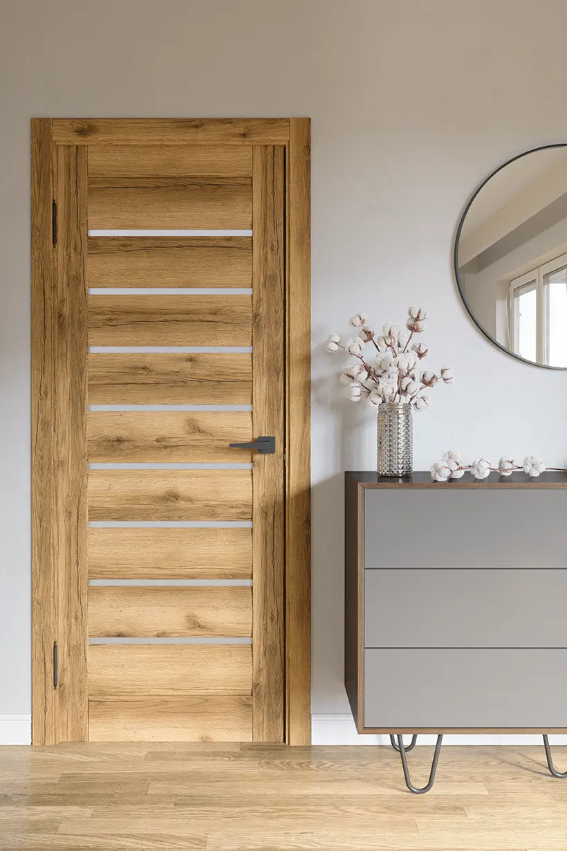 Rustic character, achieved with cracks and interesting color contrasts, makes this oak decor enliven the surface of furniture and doors. In combination with olive green or black, a very modern combination is created that fits perfectly in contemporary interiors.