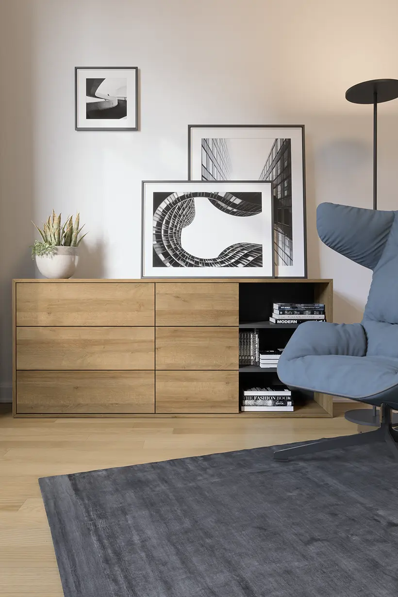 Ten niezwykle uniwersalny dekor dębowy znajduje szerokie zastosowanie w aranżacji wnętrz. W połączeniu ze strukturami betonów lub odcieniami granatu tworzy atrakcyjne rozwiązanie odpowiadające dzisiejszym trendom wzorniczym.